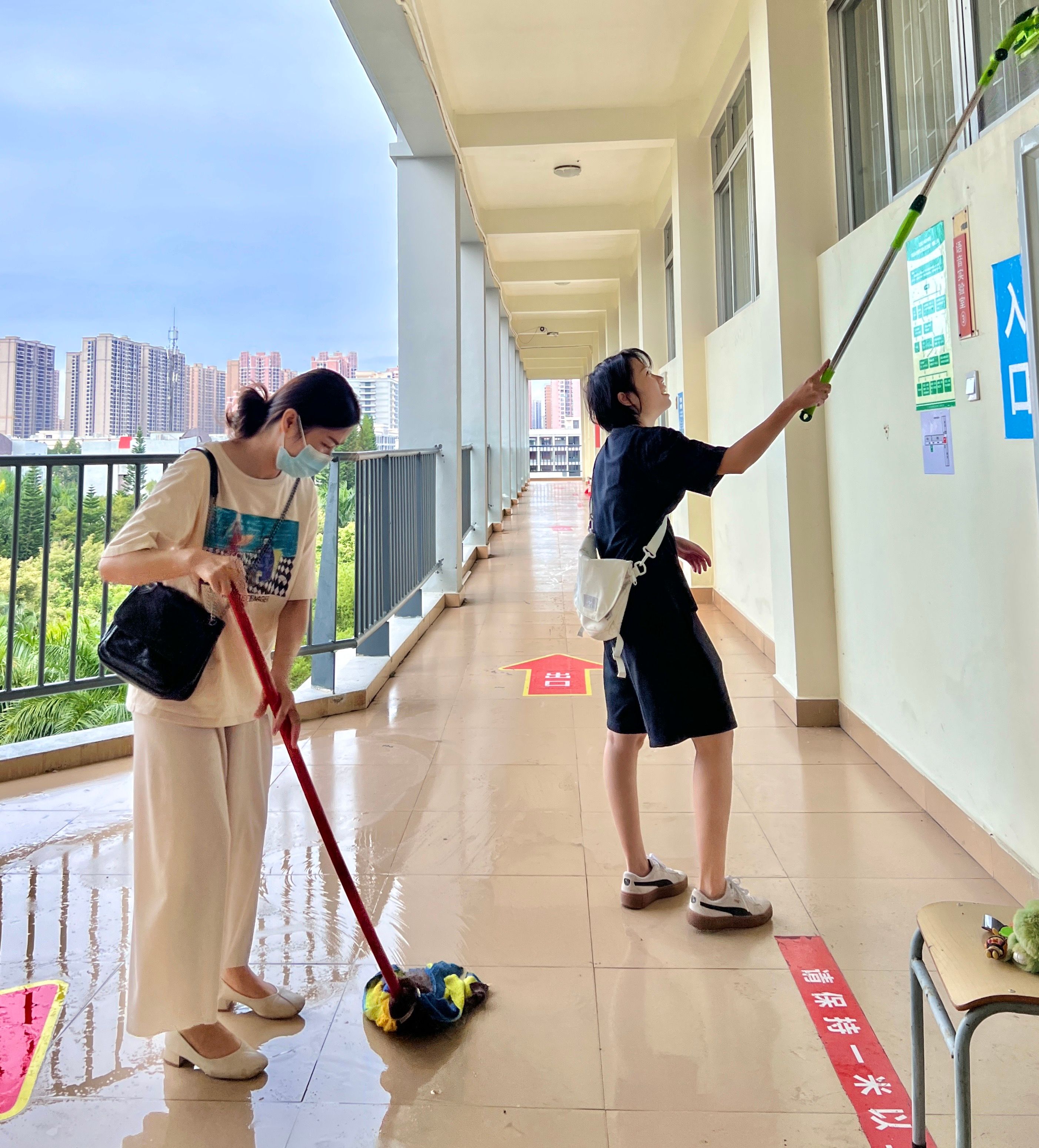 根据学校安排,本次人文教育学院负责清扫区域为觉悟楼3楼至5楼的所有教室以及走廊。清扫内容包括每层每个教室的门、窗、玻璃、风扇、空调、地面、墙面的清洁以及防疫标识的更换,要求做到窗明几净、墙面地面干净无污渍、教室物品物品摆放整齐、防疫标识更换到位。