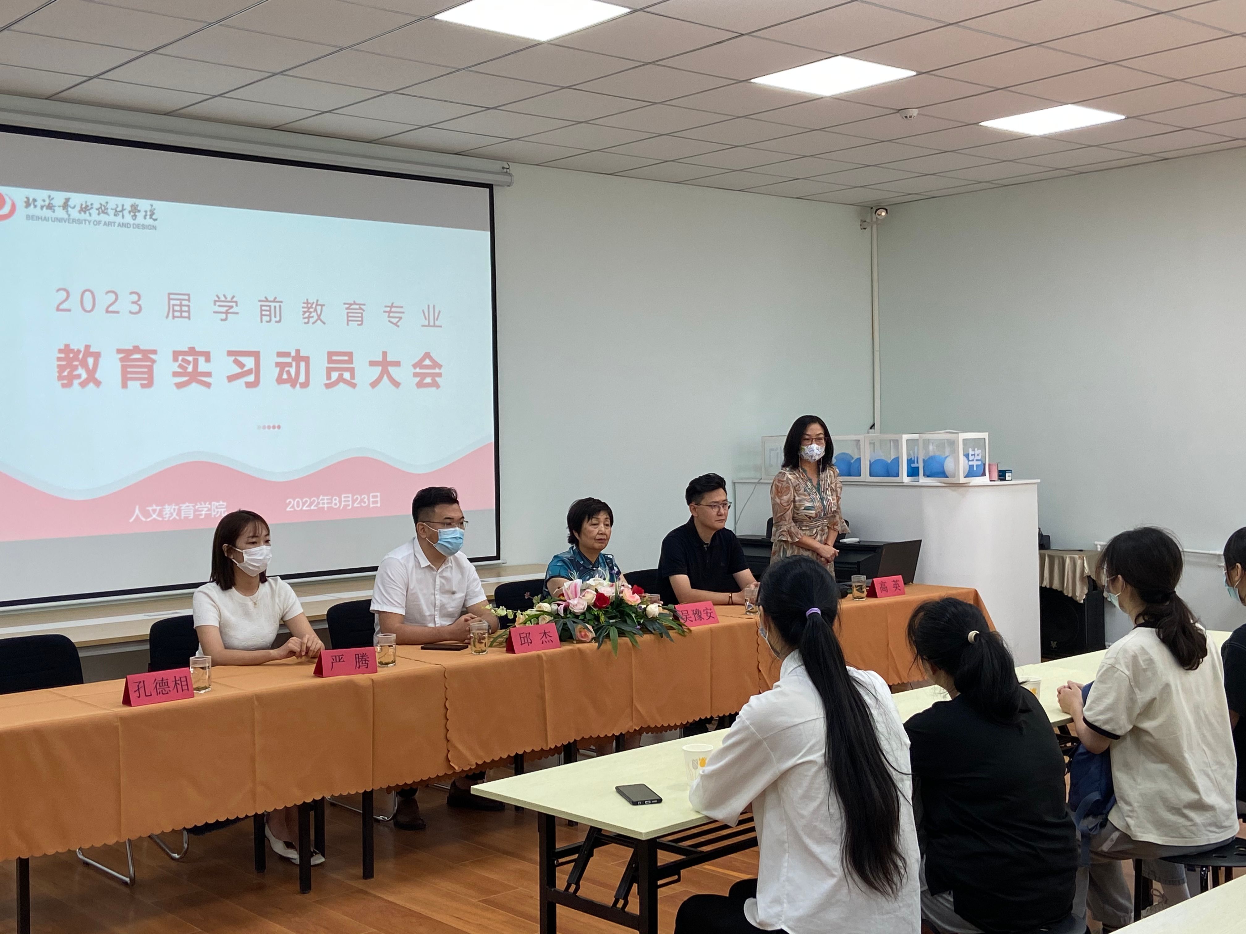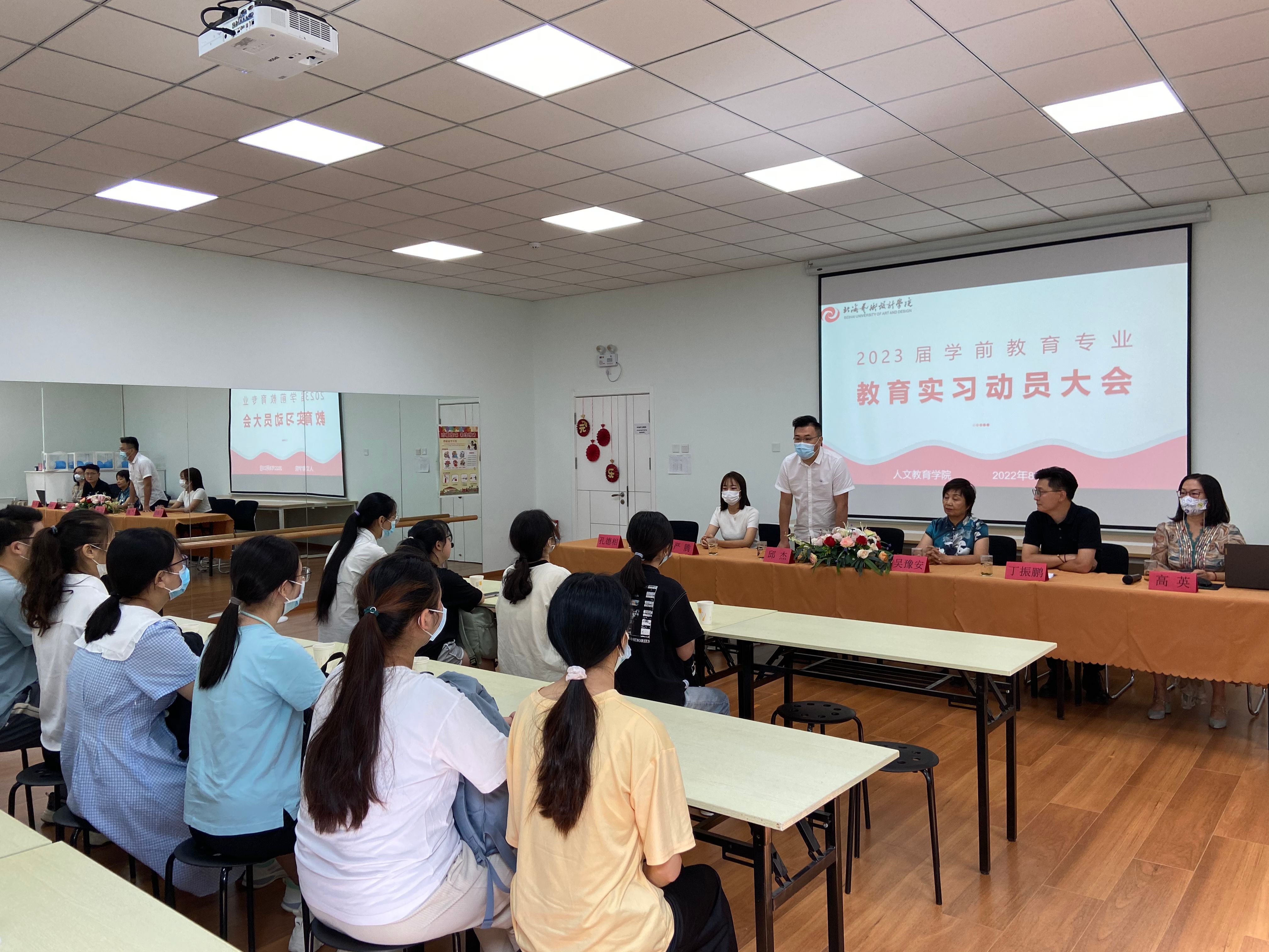 2022823日上午,人文教育学院2023学前教育专业实习动员大会在北京京师教育集团甜水园召开。京师教育集团总园园长吴豫安、北海艺术设计学院副校长邱杰北京实践基地办公室副主任严腾、班主任德相实习带队老师丁振鹏出席动员大会。大会由丁振鹏老师主持。
