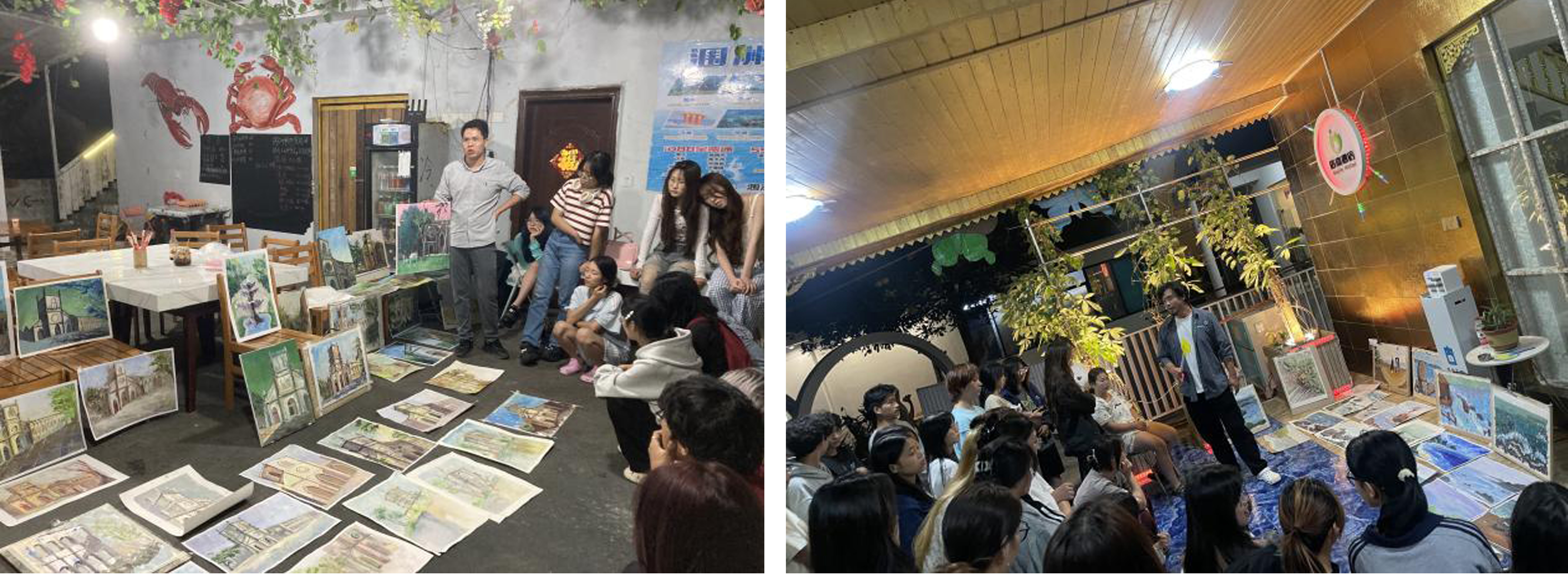 每天晚上的评画环节则为学生提供了展示与交流的机会,帮助他们在实践中不断精进技艺。同学们还以个人视角融入创意,尝试用画笔表达涠洲岛的精神内涵与艺术情感,创作出许多具有个性化特色的优秀作品。