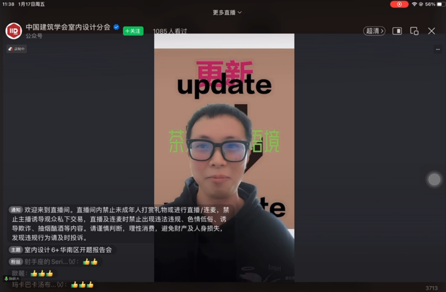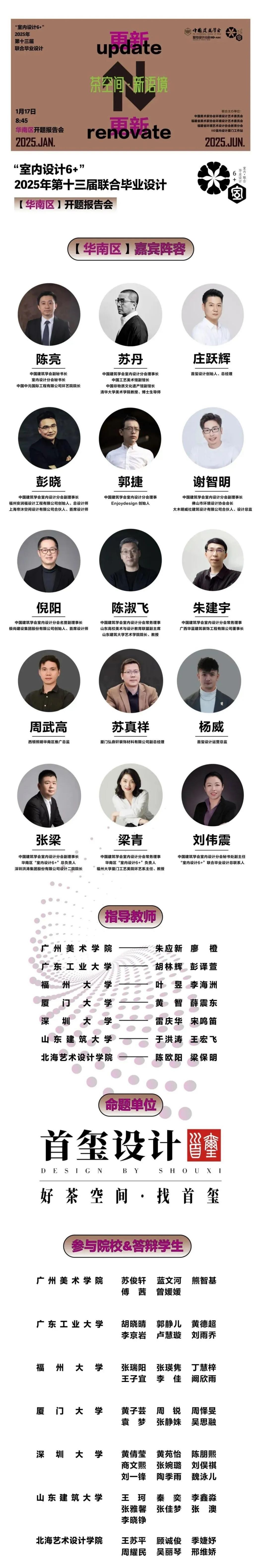 2025年1月17日,由中国建筑学会指导的“室内设计6+”第十三届联合毕业设计在线上举办了开题报告会。本次联合设计的总命题为“更新·更新”,华南区分命题为“茶空间·新语境”。开题报告会吸引了9.5万人在线观看和学习,显示出极高的关注度和参与度。我院教师梁保明和陈欧阳带队参与了此次会议,并发表了精彩的讲话。