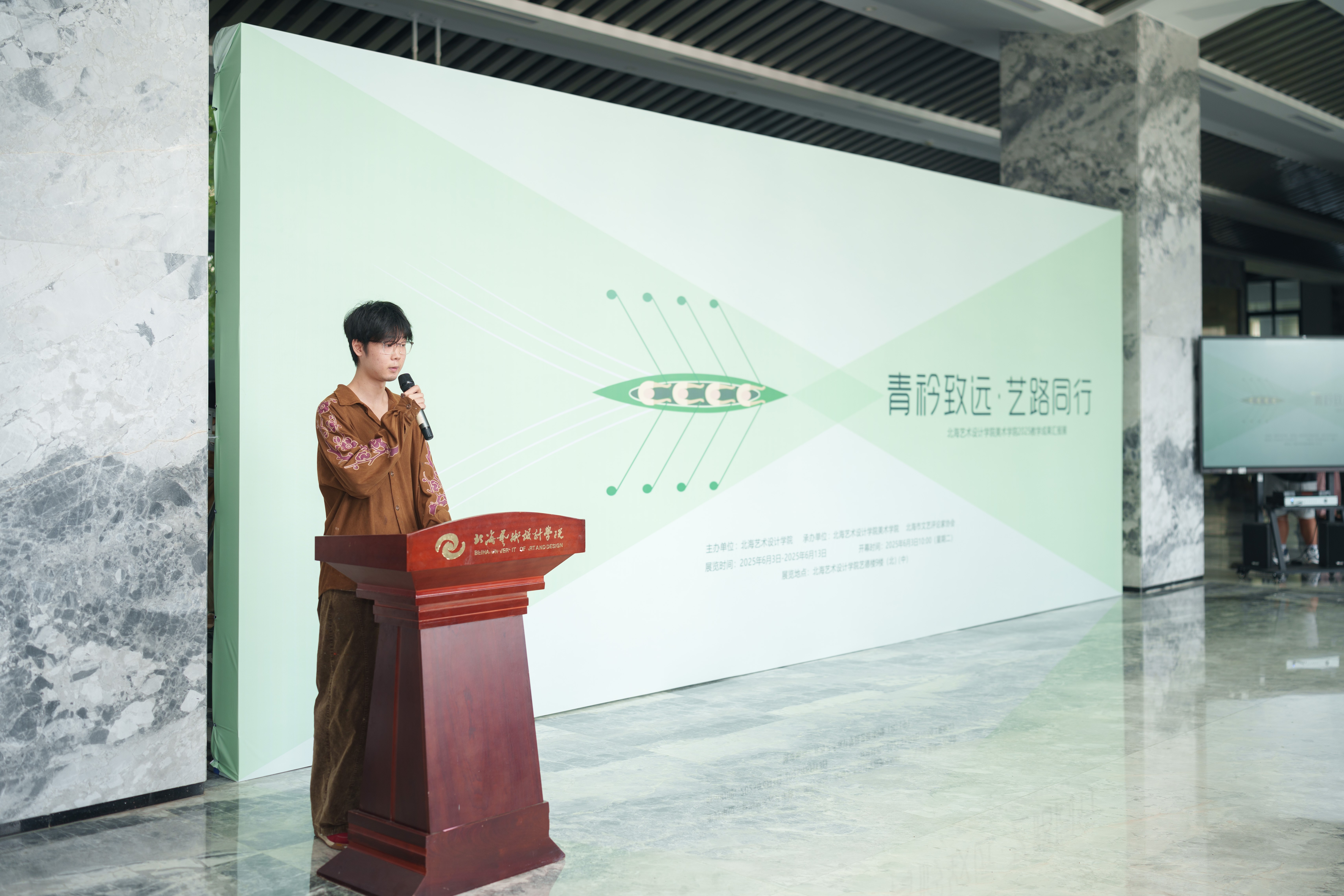 最后,由北海艺术设计学院党委书记覃宪儒,宣布“青衿致远艺路同行”教学成果汇报展开幕。