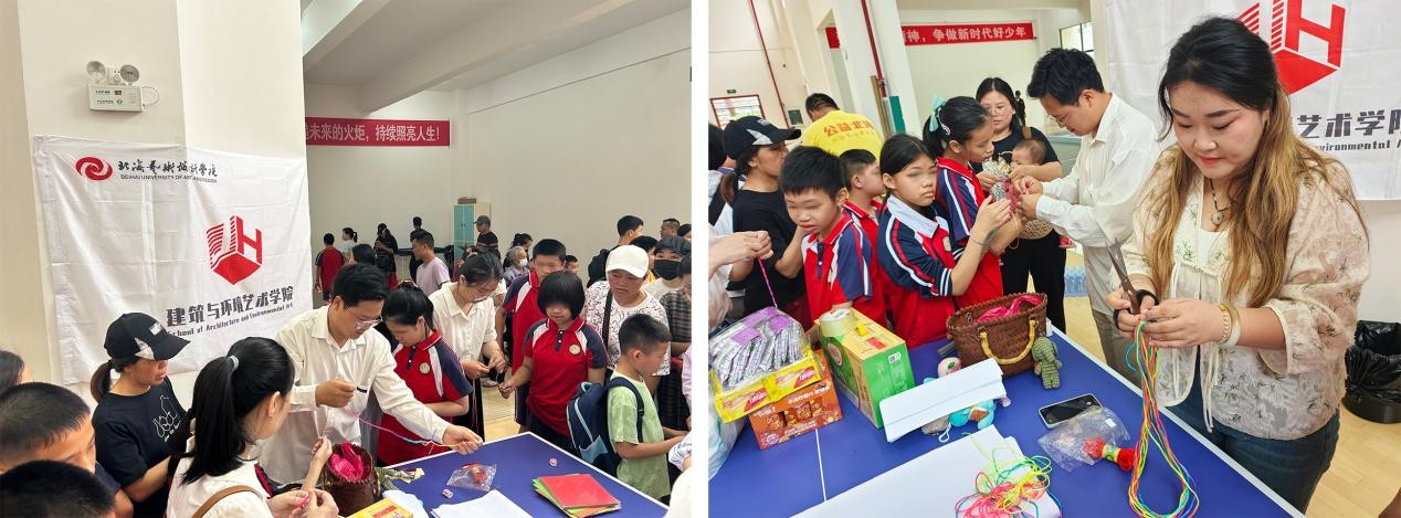 为深入贯彻落实第三十五次全国助残日精神,弘扬扶残助残的社会风尚,2025年5月30日,北海艺术设计学院建筑与环境艺术学院应邀参加北海市特殊教育学校主题为“弘扬自强与助残精神,凝聚团结奋进力量”的盛大开放日活动。本次活动我院以“艺术点亮心灵˙爱心共筑未来”为主题,通过绘画创作、手工折纸、编织五彩绳等丰富多样的互动形式,为特殊儿童带去温暖与欢乐。建筑与环境艺术学院分团委书记赵晓盼、副书记陈宣辰、综合办干事陈慧易三位教师代表我院参加本次公益活动,以实际行动传递关爱,助力特殊儿童健康成长。