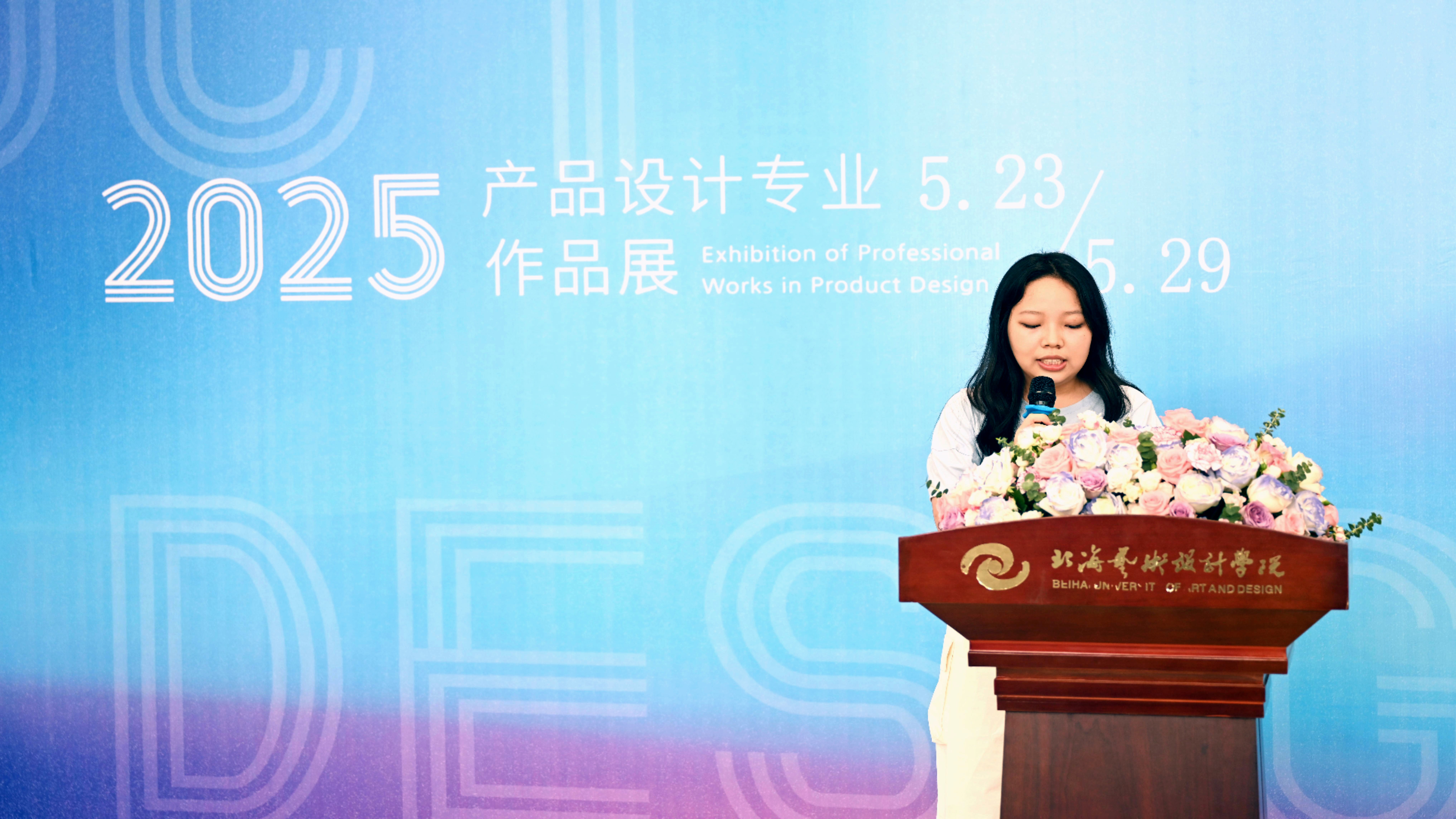 22级学生代表李佳分享了对设计的理解:设计不仅是创意的表达,更是对生活的回应与关怀。她回顾了三年来的学习历程,从懵懂到热忱,从课堂理论到实践探索,每一件作品都凝结着灵感与汗水。她特别感谢母校提供的广阔平台和老师的悉心指导,并表示未来将带着这份热爱与责任,继续追求设计的价值。
