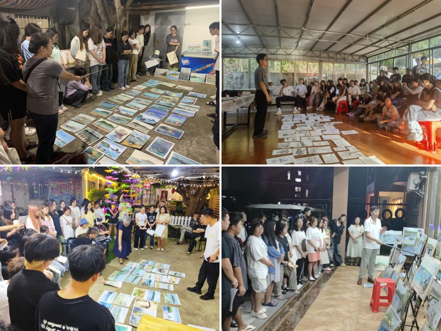 接下来的三天,在教师的带领下同学们前往涠洲岛革命烈士纪念碑、南湾码头、涠洲岛火山国家地质公园盛塘村开展教学实践活动,大家运用所学美术与设计专业方面的知识,以画笔记录下涠洲岛的自然景观与人文风貌,在实地考察中感受岛上的民俗、历史与发展。在白天的写生过程中,教师们通过现场讲授、作范画、逐个辅导等方式取景、构图、光线、色调等方面为同学们进行了悉心的指导。晚上,教师们组织各班级开展集中讲评活动,指出画面中的优点和不足,分析问题,总结得失。