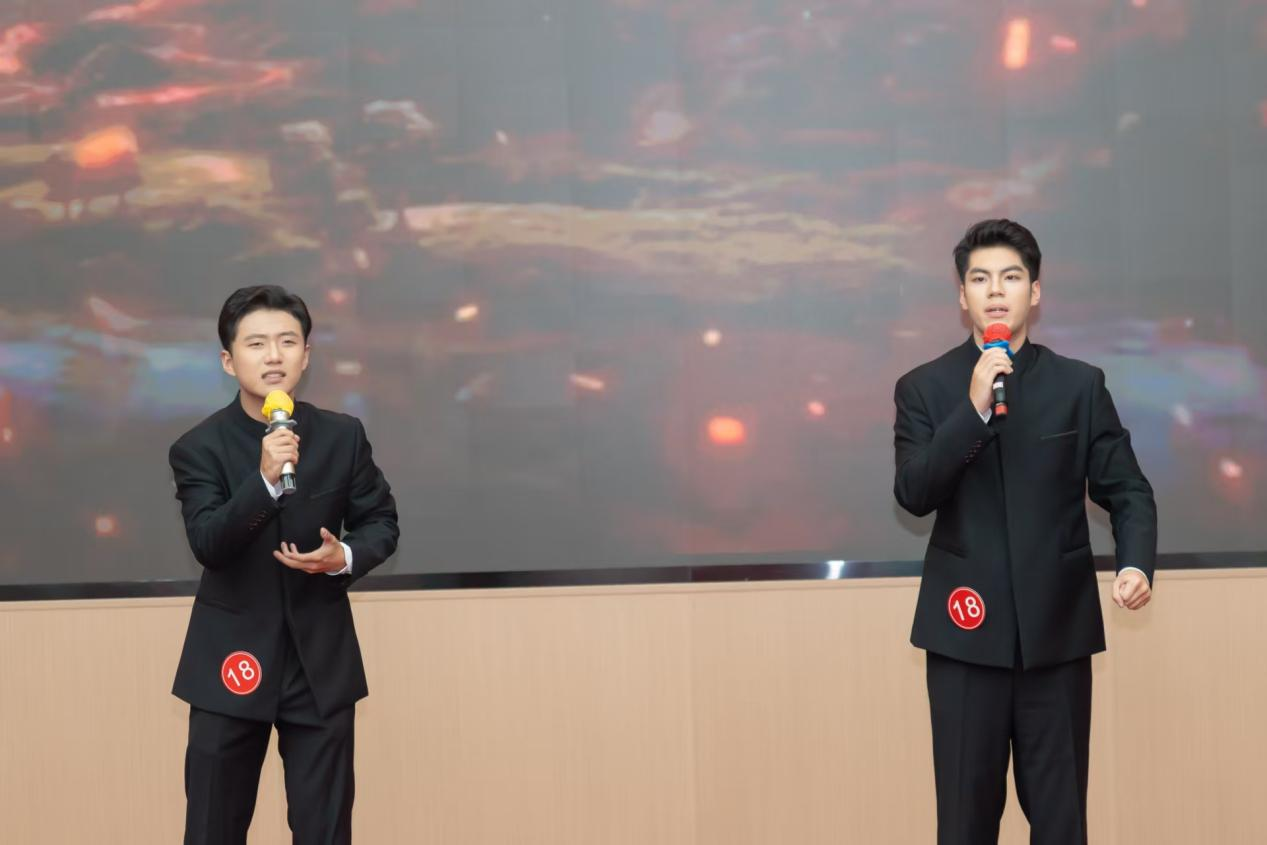本次大赛以“铭记抗战烽火,传承抗战精神”为主题,作为广西高校语言艺术领域极具影响力的赛事,赛事自启动以来便得到全区各高校积极响应,历经校内初评、自治区复赛的层层严苛筛选,最终仅有24组选手从数百部作品中脱颖而出晋级决赛,高水平角逐的激烈程度不言而喻。传媒艺术学院高度重视此次赛事,选送作品《在欢呼的人群中》精准锚定“胜利喜悦与先烈缅怀”的情感基调,从语言表达的节奏轻重到舞台呈现的姿态眼神,以细节展现了对作品精神的深刻理解。决赛现场,李昀泽、冯奎荣同学凭借扎实的语言功底、默契的舞台配合,将抗战胜利后人民群众的自豪与崇敬诠释得淋漓尽致,稳健大气的台风赢得评委团高度认可和现场观众阵阵掌声。