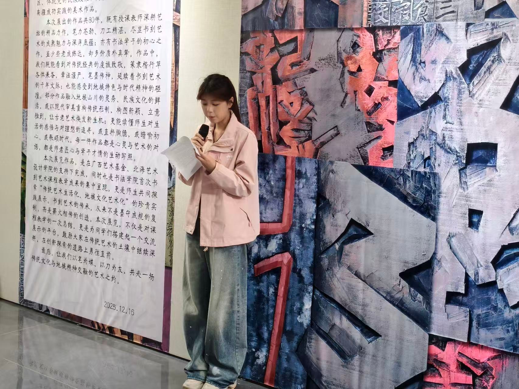 12月19日下午,“桂风书刻——江威龙书刻艺术展暨书法学院首届师生书刻作品展”在北海艺术设计学院唯物楼四楼展区正式拉开帷幕。本次展览作为广西艺术基金2025年度美术创作资助项目的重要成果,由北海艺术设计学院书法学院主办、书法学教研室承办,展期持续至12月31日。