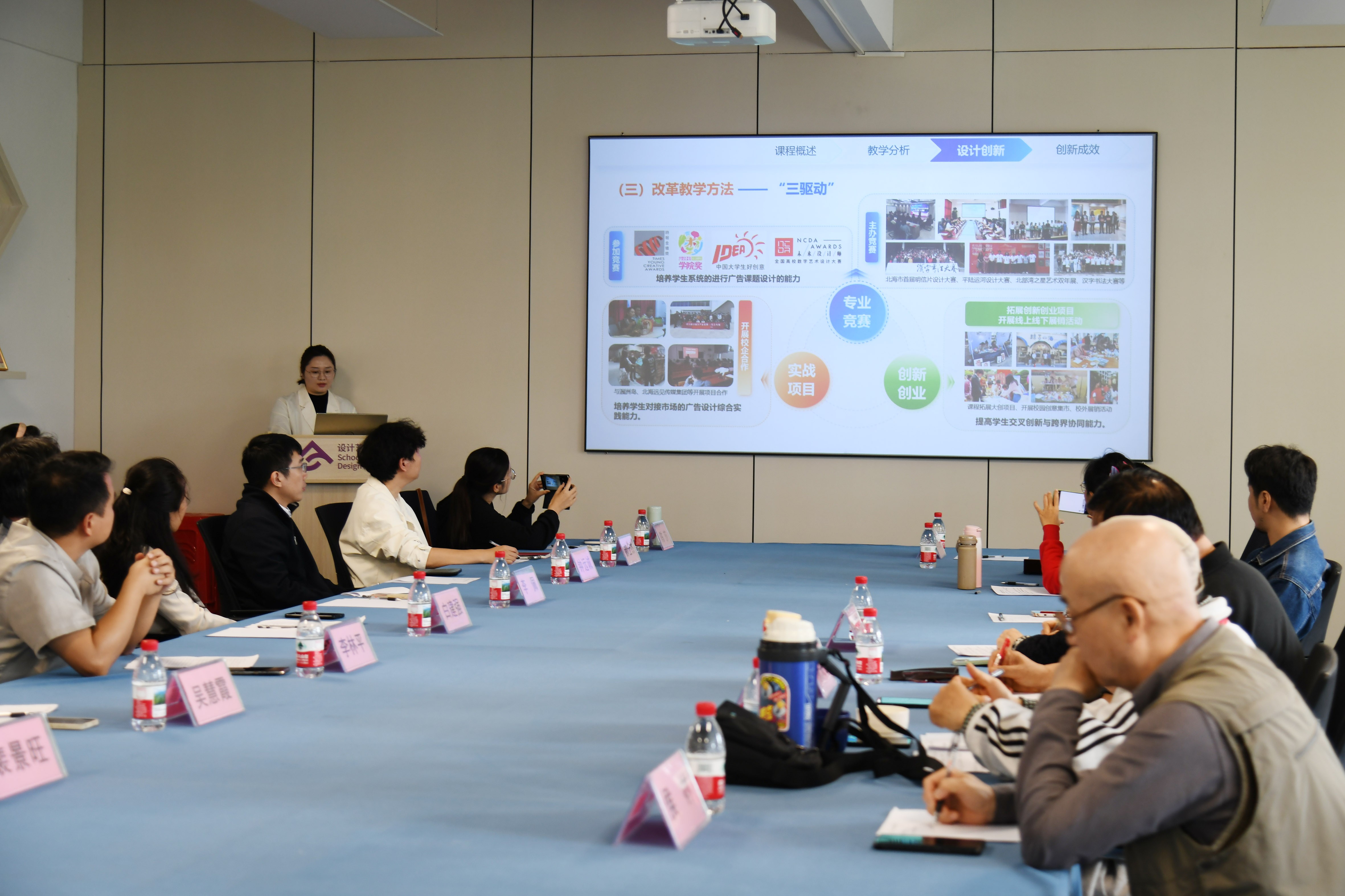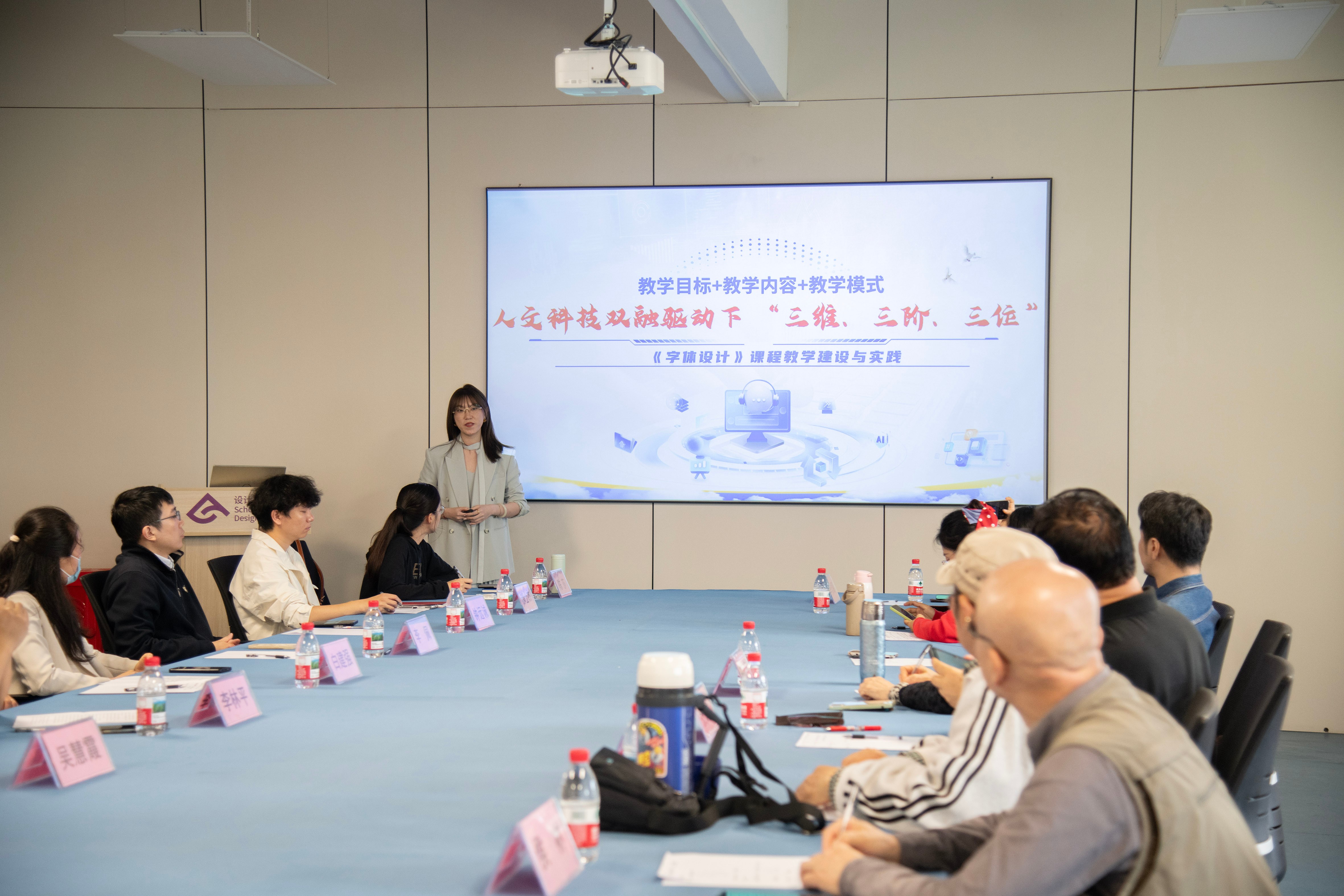 接下来由白建强副院长介绍了学院面对AI浪潮,通过强化艺科融合在专业人才培养方案设置上所做的积极调整以及课程建设上取得的成果。随后,吴慧霞副院长分享了以《一核心、二融合、三驱动、四维递进教学模式》为题,阐述了《广告设计》课程教学创新的具体举措;李佩副院长以《四链四 阶智能驱动》为题,汇报了AI如何系统性赋能《文创产品设计》课程;陈莎老师以《三维联动 实战赋能 素养进阶》为题,阐述了《品牌设计与VI》课程的教学改革思路与成果;李欣颐老师则以《人文科技双融驱动下“三维、三阶、三位“》为题,围绕《字体设计》课程介绍AI数智技术在课程各教学环节中的融合应用案例。这些汇报从不同专业角度,生动呈现了学院教师在AI教学应用前沿的积极探索。