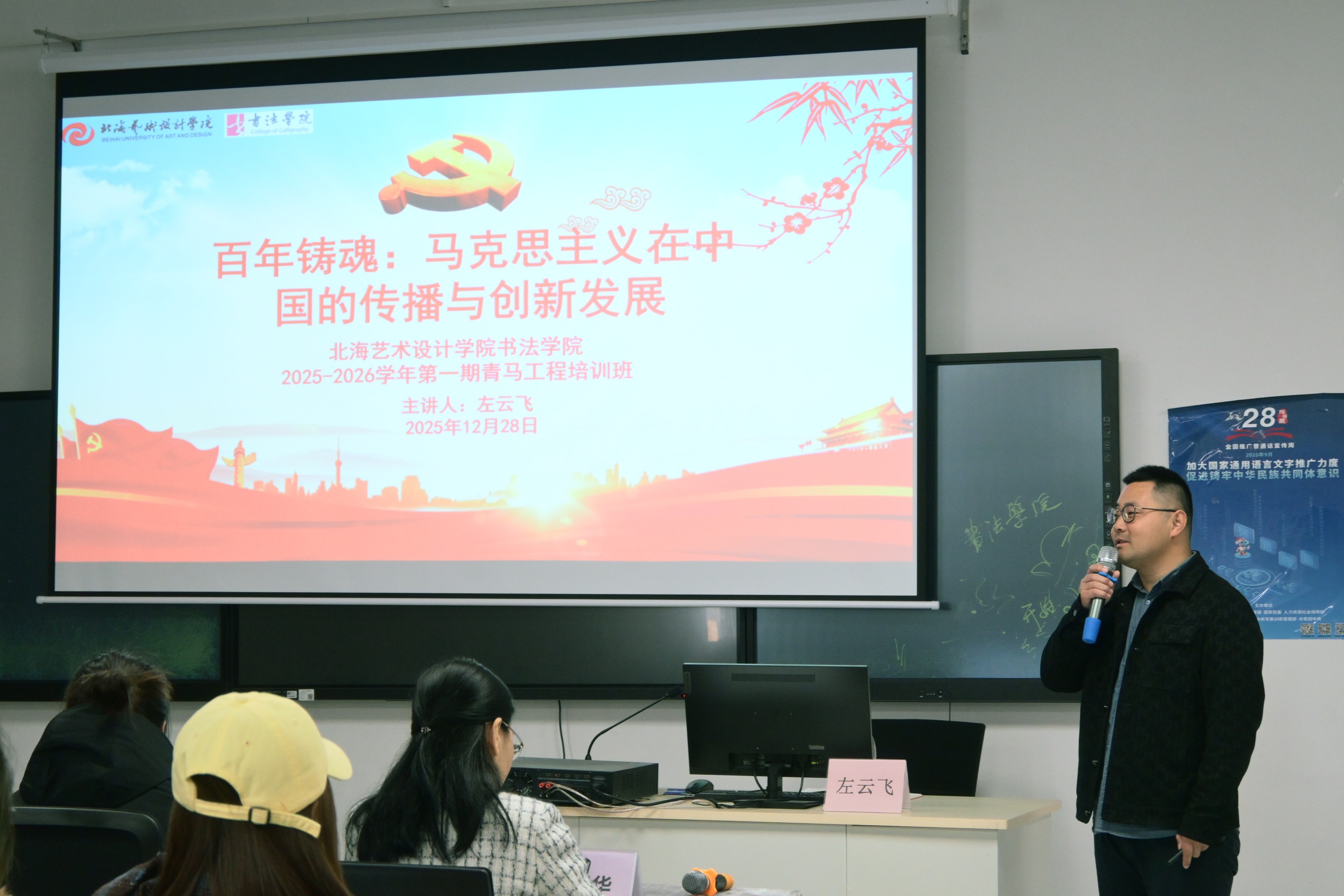 第二讲由书法学院党支部副书记左云飞主讲,他以“马克思主义在中国的传播与创新发展”为题,系统阐述“青马工程”的培养目标与重要意义,回顾马克思主义中国化的实践历程,并强调青年应注重理论联系实际,积极投身国家发展与民族复兴的伟大事业。