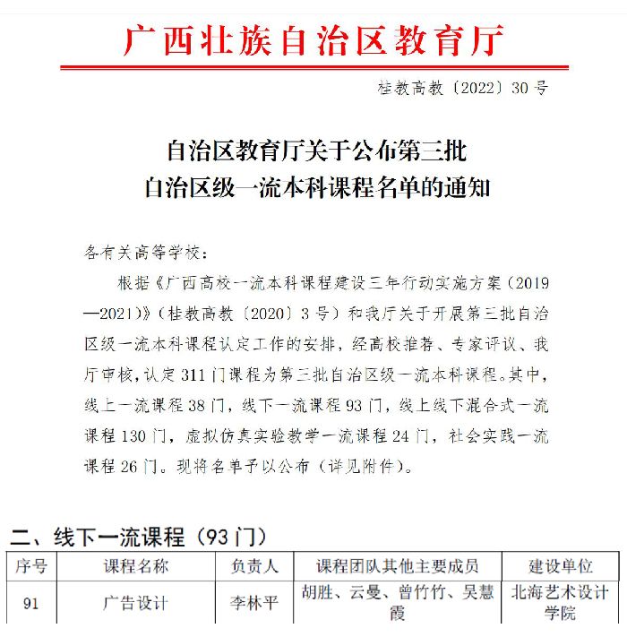近日,根据《自治区教育厅关于公布第三批自治区级一流本科课程名单的通知》(桂教高教〔2022〕30号),我李林平负责的 《广告设计》课程认定为自治区级线下一流本科课程。