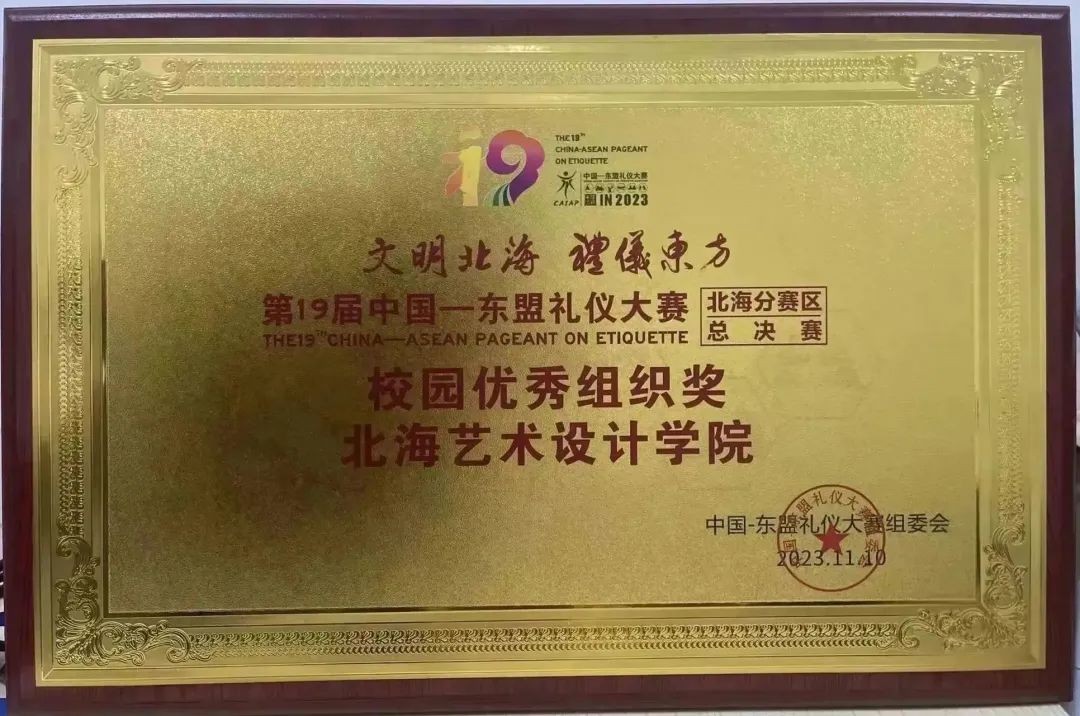 2023年11月10日中午,以知礼、懂礼、学礼为宗旨的“文明北海•礼仪东方”第19届-中国东盟礼仪大赛北海总决赛在北海职业学院举行。其中,我校荣获校园优秀组织奖!