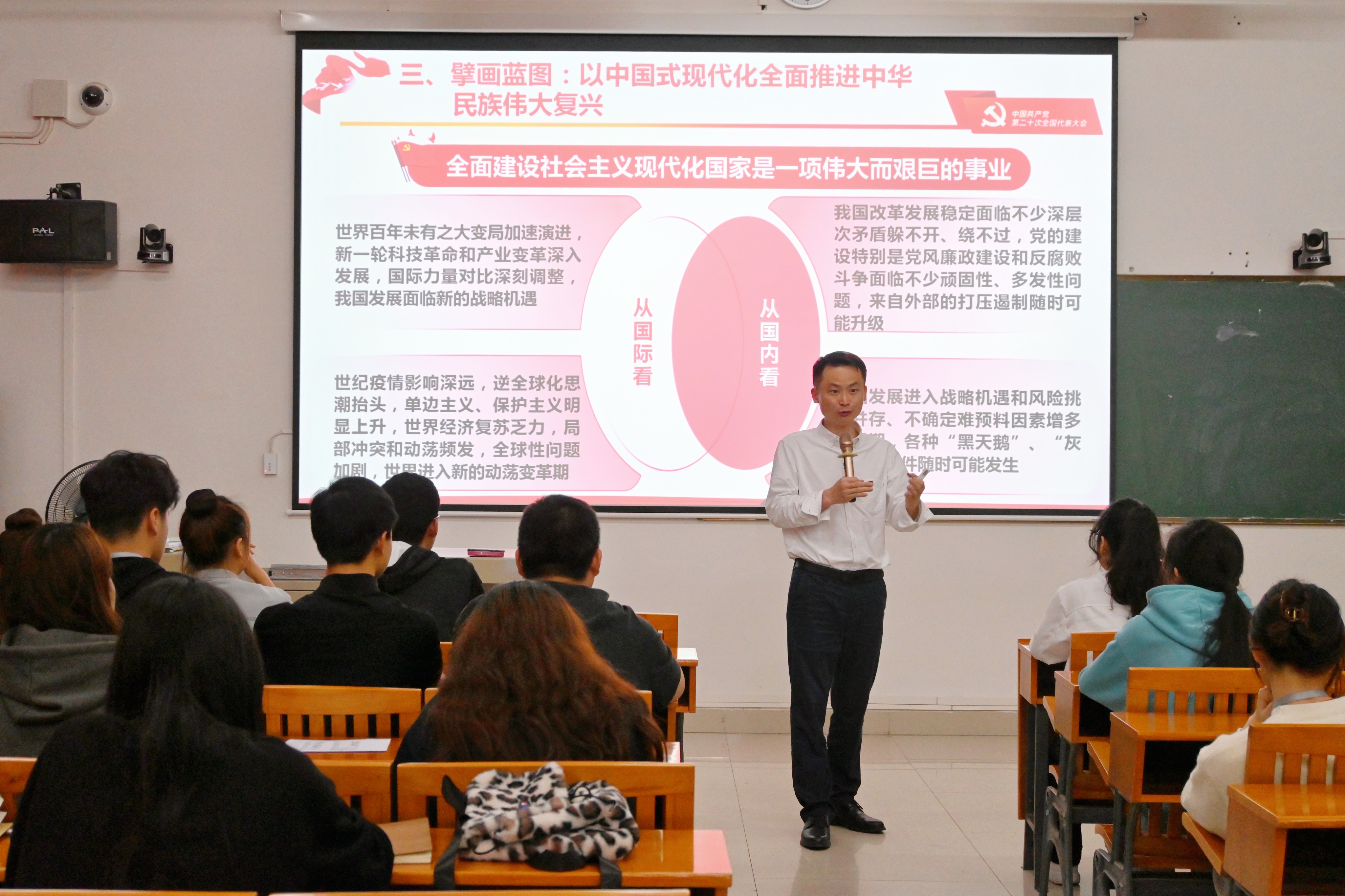 宣讲会上,刘承初委员指出,学习党的二十大精神,要注意将学习成果转化为指导工作实践的驱动力和执行力,面对当前学校本科教学合格评估这一光荣而又艰巨的任务,同学们要充分认识教学合格评估工作的重要性,端正心态,实干担当,积极配合学校做好评估的各项工作。