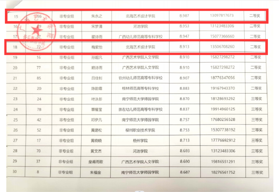 10月28日-30日,第三届广西高校钢琴大赛在广西艺术学院顺利举行。我校人文教育学院学生朱永之、李洁、刘菁菁、梅紫怡代表学校参赛,经过激烈角逐,我校哲学专业学生朱永之和艺术教育专业学生梅紫怡荣获非专业组二等奖,这是我校学生在该项赛事中取得的最佳成绩。