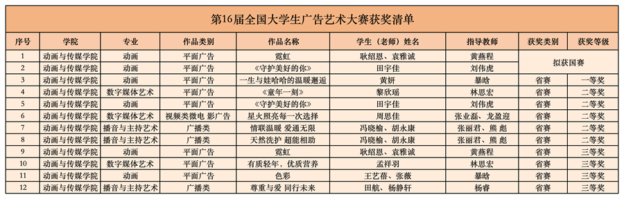 在第16届全国大学生广告艺术大赛中,动画与传媒学院作品《霓虹》荣获国赛三等奖、作品《守护美好的你》荣获国赛优秀奖,《一生与娃哈哈的温暖邂逅》《童年一刻》等10件作品荣获广西壮族自治区省赛奖项。