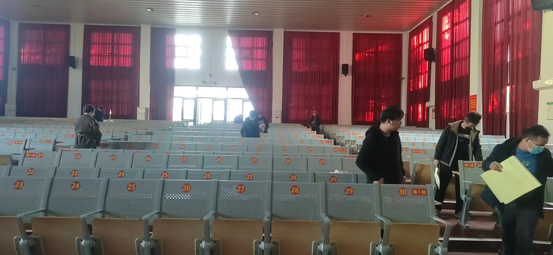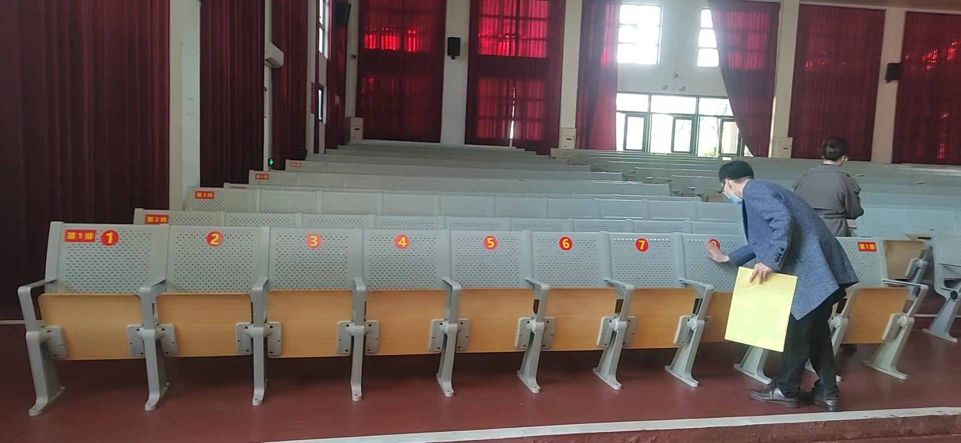 设备与信息处老师给礼堂780个座位换上新标签,新座位更显得有序规范。(凌玲/摄)
